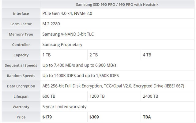 Dưới đây là bảng khái quát thông số kỹ thuật của dòng SSD 990 PRO: