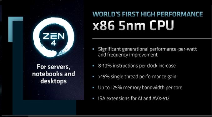 Zen 4 mang đến chip lõi CPU mới cũng như khuôn I / O mới, hỗ trợ thêm cho các tính năng như PCI-Express 5.0 và bộ nhớ DDR5. Và về mặt hiệu suất, AMD đang hướng tới những cải tiến đáng kể về hiệu suất trên mỗi watt và tốc độ xung nhịp so với các sản phẩm dựa trên Zen 3 hiện tại của họ.