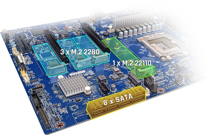 Về lưu trữ cũng được đầu tư tốt với : 4 khe cắm M.2 trong đó có 1 khe M.2 22110 và 3 khe M.2 2280 cùng 8 cổng SATAIII cho nhu cầu lưu trữ của khách hàng với nhiều dữ liệu quan trọng, sức chứa lớn