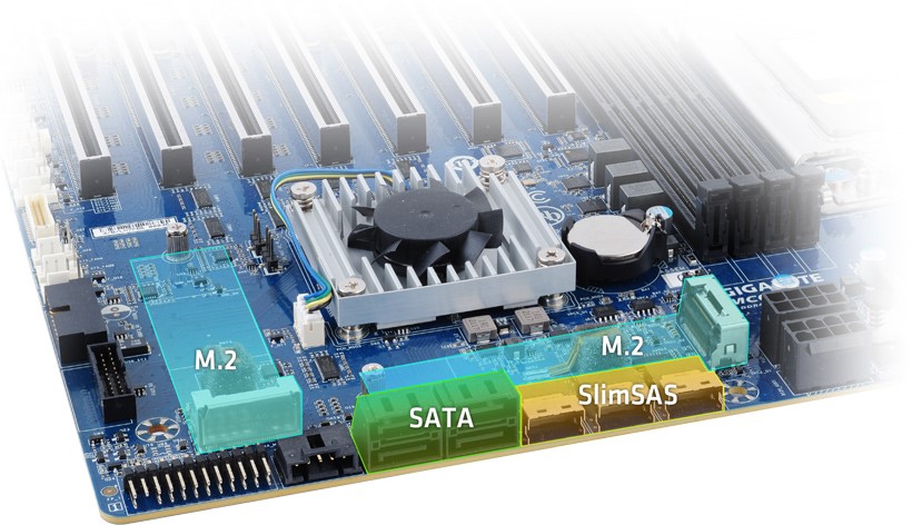 Khả năng lưu trữ lớn cũng được giúp thỏa mãn nhu cầu lưu trữ ngày càng cao cũng như yêu cầu tốc độ truy xuất lớn thông qua các chân cắm chờ: 2 chân cắm M.2 2280 SSD, 4 cổng SATAIII, 3 chân cắm SlimSAS