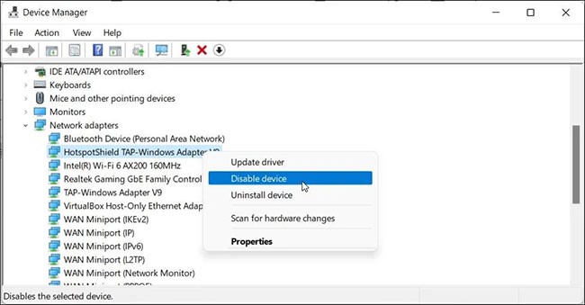 Sau khi bị vô hiệu hóa, hãy kiểm tra xem sự cố đã được giải quyết chưa. Nếu chưa, hãy tìm các VPN network adapter khác và tắt chúng qua Device Manager.