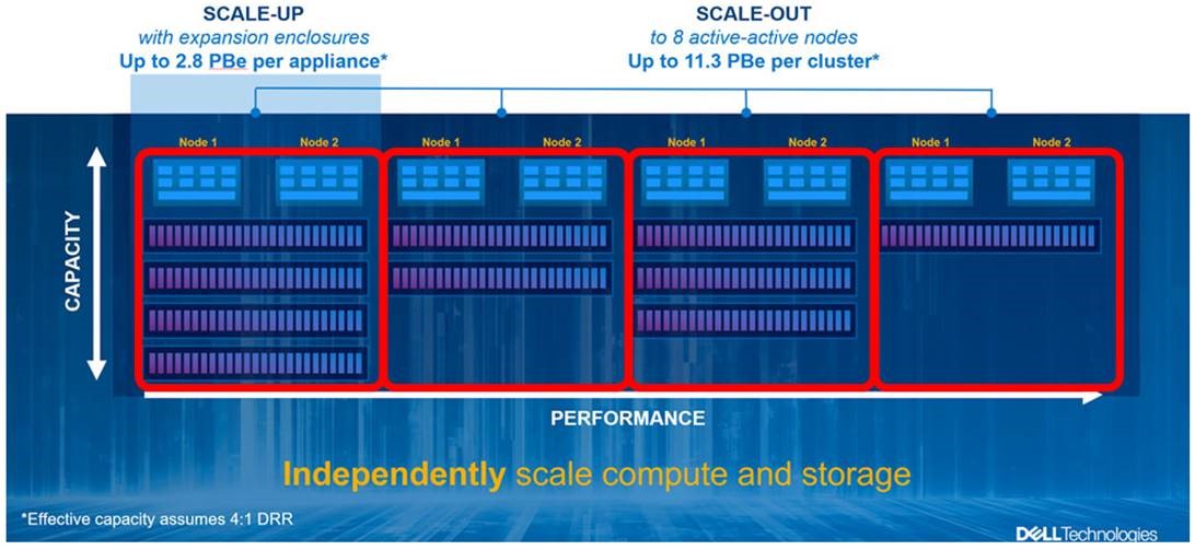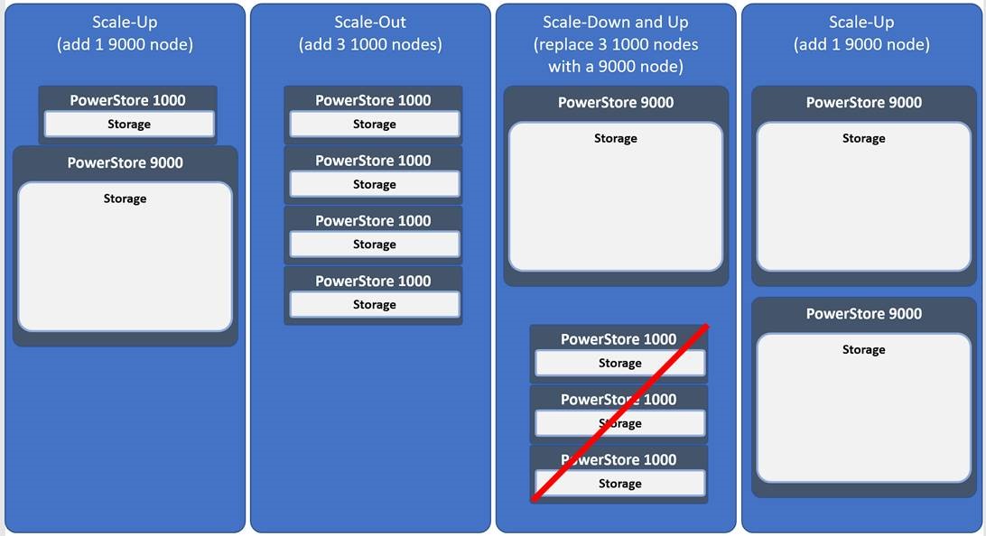 Một khía cạnh thú vị của PowerStore là nó cho phép hệ thống lưu trữ tăng giảm quy mô (scale-up hay scale-down) bằng cách đưa một thiết bị PowerStore hiệu năng cao hơn (scale-up) vào một cụm và sau đó hợp nhất tải công việc từ thiết bị hiệu năng kém hơn vào đó. Sau đó, một công ty có thể tái sử dụng các thiết bị không sử dụng (scale-down). Có thể dễ dàng thấy cách mà một mô hình như vậy sẽ cho phép một công ty liên tục phát triển môi trường lưu trữ của mình một cách toàn diện, không gián đoạn bằng cách mở rộng môi trường của mình ra theo chiều ngang, nâng cấp lên và hạ cấu hình xuống khi cần thiết, một cách liên tục.