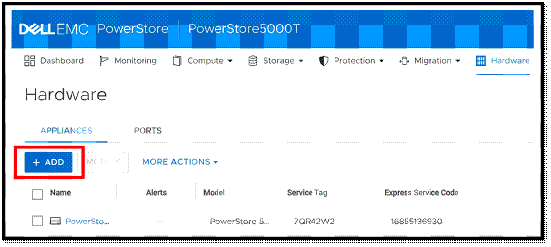Sau khi unbox và cắm 7000T vào nguồn và hệ thống mạng, chúng tôi đăng nhập vào trình quản lý PowerStore Manager và click vào [ADD].