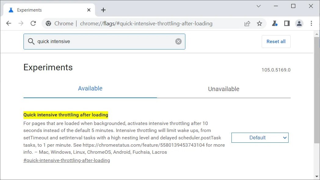 Bây giờ, Google đang thử nghiệm tính năng mới mang tên “Quick Intensive Throttling” giúp giảm thời gian gia hạn 5 phút xuống chỉ còn 10 giây. Do đó, các tab sẽ bị ngừng nhiều hơn và để giảm nhanh việc sử dụng CPU cũng như kéo dài hơn nữa thời lượng pin.