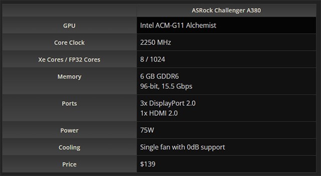 Cần lưu ý rằng model Arc A380 duy nhất đang được mở bán tại thị trường Hoa Kỳ là một biến thể từ ASRock, có tên gọi ASRock Challenger Arc A380. Card chỉ sở hữu một quạt duy nhất hỗ trợ zero-dB (tự tắt khi tải nhẹ), 6GB bộ nhớ GDDR6 và kết nối PCIe 4.0. Các cổng kết nối có sẵn bao gồm 3 cổng DisplayPort 2.0 và 1 cổng HDMI 2.0. Đây rõ ràng là cấu hình đặc trưng cho một mẫu GPU rời thuộc phân khúc phổ thông giá rẻ.