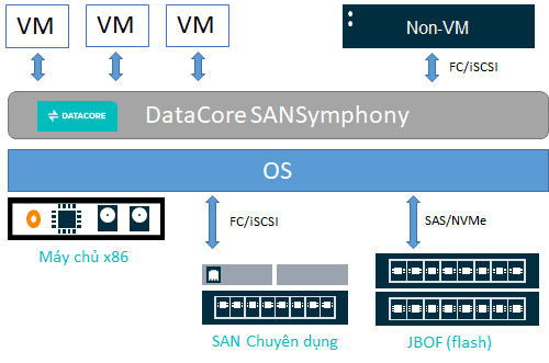 Hơn thế nữa, chính bản thân DataCore SDS là phần mềm lưu trữ được cài trên các máy chủ x86 bất kỳ như HPE ProLiant, Dell Power hay Supermicro. Phần mềm này biến các ổ HDD, SSD hay NVMe thành tài nguyên lưu trữ cho vào “Hồ tài nguyên”. Chúng ta dễ dàng mở rộng tài nguyên bằng cách mua thêm máy chủ và ổ cứng (HDD, SDD) thay vì mua cả một tủ đĩa chuyên dụng với chi phí cao và thời gian chờ lâu.
