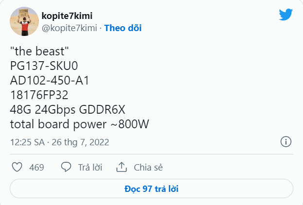 Đáng nói rằng, đây không phải là lần đầu tiên rò rỉ về một mẫu Card RTX 40 Series có các thông số khủng. Chính @kopite7kimi trước đó cũng đã đề cập tới một sản phẩm cũng mang nhân AD102 và thậm chí sở hữu nhiều chỉ số kinh dị hơn.