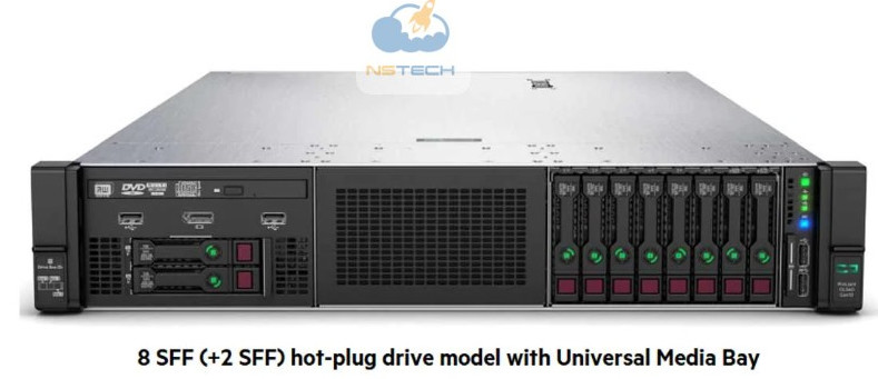 Các lựa chọn lưu trữ được mở rộng; DL560 Gen10 sử dụng bố cục cấu hình khoang 8 + 8 + 8 tiêu chuẩn của HPE, cho phép tối đa 24 ổ đĩa SFF được cài đặt trong các khối. Bạn cũng có thể phù hợp với thiết bị truyền thông đa phương tiện của HPE ở khoang trái cung cấp hai USB3, một ổ đĩa quang DisplayPort cộng và phòng cho hai ổ đĩa SFF.