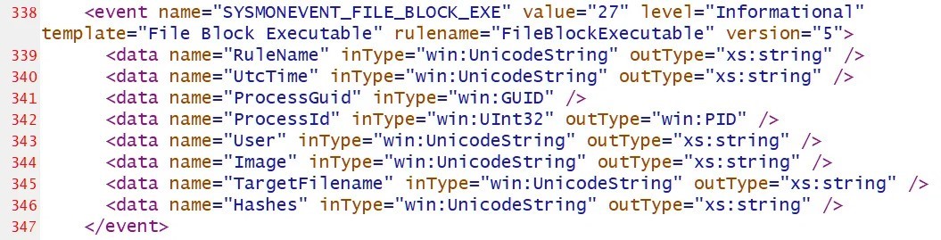 Lược đồ Sysmon hiện tại là phiên bản 4.82, hiện bao gồm tùy chọn cấu hình “FileBlockExecutable” để chặn việc tạo tệp thực thi dựa trên đường dẫn, tên, hàm băm của chúng và chương trình đang cố gắng tạo tệp như bên dưới đây: