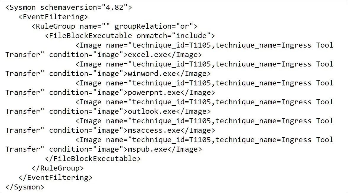 Ví dụ: Nếu bạn có danh sách các hàm băm của một mã độc đã biết, bạn có thể cấu hình Sysmon để chặn việc tạo các tệp thực thi phù hợp với hàm băm đó. Hoặc nếu bạn muốn ngăn các tệp đính kèm Office độc hại phát tán mã độc, bạn có thể ngừng tạo tệp thực thi từ Word hoặc Excel.