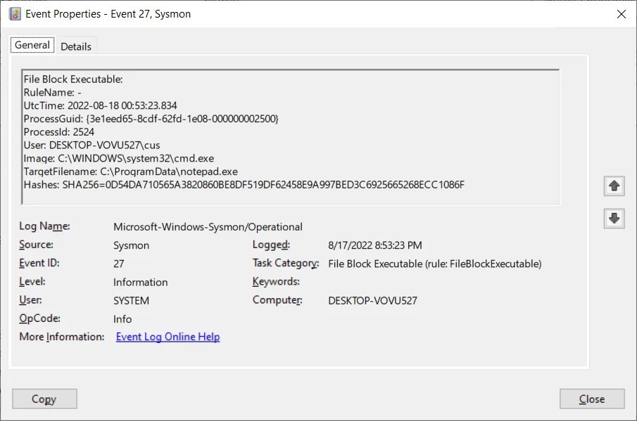 Với tính năng FileBlockExecutable được kích hoạt, khi tệp thực thi được tạo và khớp với quy tắc, Sysmon sẽ chặn tệp và tạo mọt “Event 27, Sysmon” trong Event Viewer.