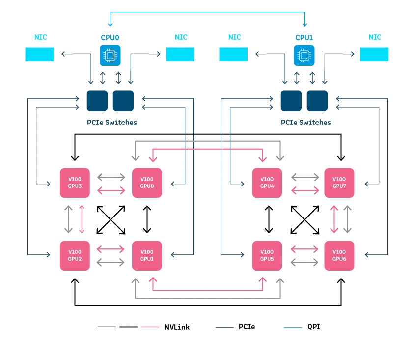 - Lên đến 8 GPU lõi Tensor Tesla V100 với bộ nhớ 32 GB