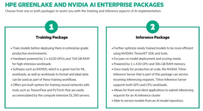 NVIDIA AI Enterprise được triển khai trên các máy chủ HPE ProLiant DL380 và DL385 được NVIDIA chứng nhận chạy VMware vSphere với Tanzu. HPE GreenLake cho phép khách hàng có được NVIDIA AI Enterprise trên cơ sở pay-per-use, với khả năng linh hoạt trong việc tăng hoặc giảm quy mô và căn chỉnh theo nhu cầu của họ. Phần mềm được hỗ trợ đầy đủ bởi NVIDIA, đảm bảo hoạt động mạnh mẽ cho việc triển khai AI của doanh nghiệp.