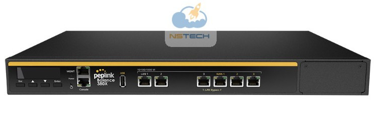 – Peplink BPL-380X có 1 port USB WAN Modem, 3 port WAN Gigabit Ethernet, ngoài ra còn có 1 Expansion Module (tùy chọn) và 3 port LAN Gigabit Ethernet.