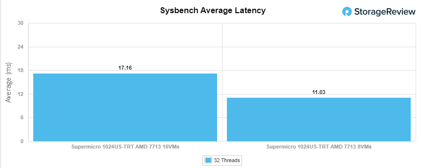 Với độ trễ trung bình của Sysbench, chúng tôi thấy điểm tổng hợp là 11,03ms cho 8VM và 17,16ms cho 16VM.