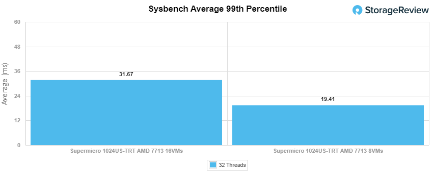 Đối với độ trễ trong trường hợp xấu nhất của chúng tôi (phân vị thứ 99), máy chủ Supermicro có điểm tổng hợp là 19,41 mili giây cho 8VM và 31,67 mili giây cho 16VM.
