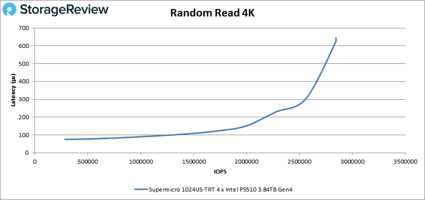 Nhìn vào số đọc 4K ngẫu nhiên, Supermicro 1024US-TRT đã ghi lại độ trễ dưới mili giây trong suốt quá trình thử nghiệm, bắt đầu ở 283.023 IOPS ở 75,2μs sau đó đạt đỉnh 2.843.723 IOPS với độ trễ 640,4μs.