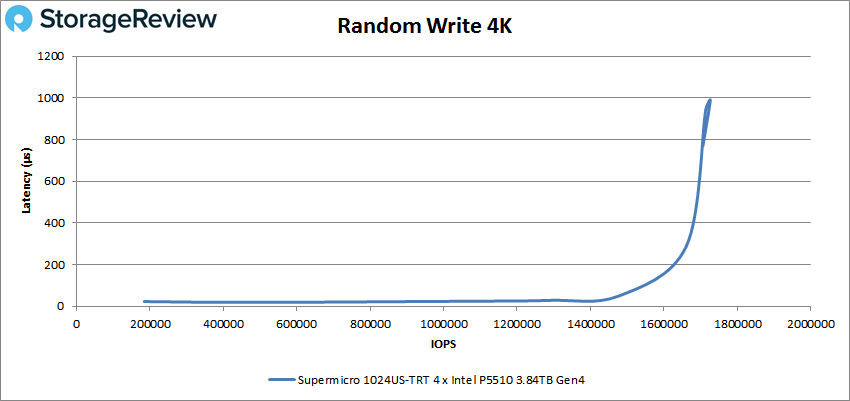 Đối với ghi 4K ngẫu nhiên, máy chủ bắt đầu 184.623 IOPS với 23μs. Nó cho thấy độ trễ rất ổn định trong suốt, cho đến khi đạt khoảng 1,6 triệu IOPS, cuối cùng nó đã tăng đột biến và đạt đỉnh là 1,72 triệu IOPS ở 990,4μs.