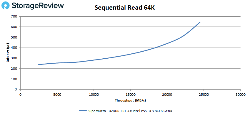 Tiếp theo là khối lượng công việc tuần tự. Để đọc tuần tự 64K, máy chủ Supermicro bắt đầu ở 39.459 IOPS (4,92GB / s) ở độ trễ 252,8μs, sau đó đạt đỉnh là 391,527 IOPS hoặc 24,2GB / s ở độ trễ 643,9μs. Nhìn thấy gần 25GB / s từ bốn ổ SSD là khá mượt mà và là một lợi thế lớn của những gì PCIe Gen4 mang lại.
