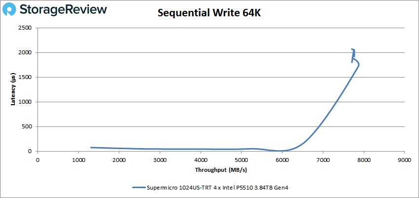 Khi ghi tuần tự 64K, 1024US-TRT cho thấy độ trễ dưới mili giây trong suốt cho đến khi đạt đến mốc 120K IOPS. Sau đó, nó đạt đỉnh ở 125.819 IOPS (hoặc 7.86GB / s) với độ trễ 1.719μs trước khi đạt hiệu suất cao nhất ở phút cuối.