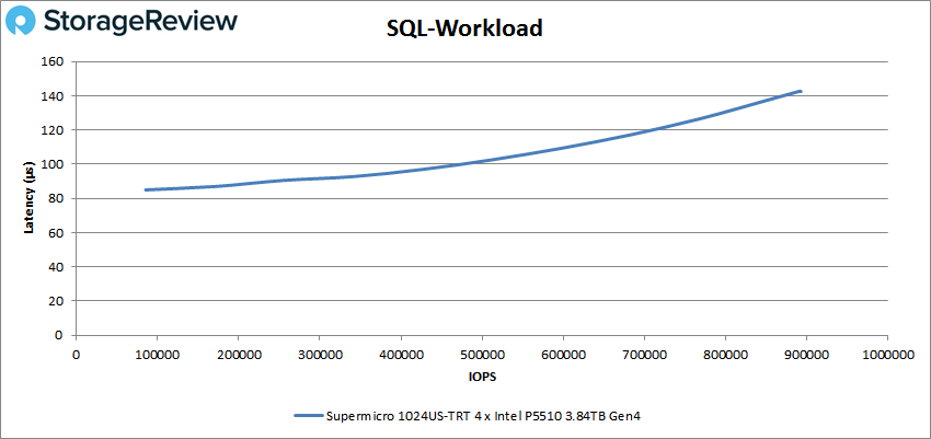 Bộ kiểm tra tiếp theo là khối lượng công việc SQL: SQL, SQL 90-10 và SQL 80-20. Bắt đầu với SQL, 1024US-TRT đạt đỉnh 892.689 IOPS với độ trễ là 142,5μs.