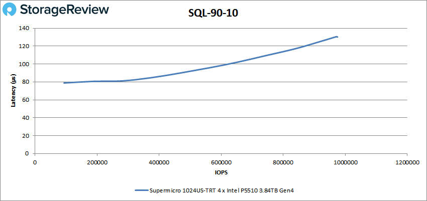 Đối với SQL 90-10, máy chủ Supermicro bắt đầu ở khoảng 94K IOPS với độ trễ chỉ 78,8μs trong khi đạt đỉnh 975.102 IOPS với độ trễ 130,1μs.