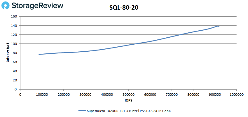 Trong khi đó với SQL 80-20, 1024US-TRT đạt đỉnh 918K IOPS với độ trễ 138μs.