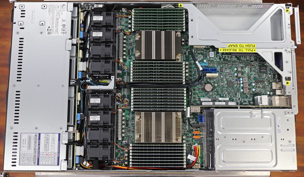 Để truy cập các thành phần bên trong của bo mạch chủ H12DSU-iN, chỉ cần tháo nắp trên bằng cách nhấn hai nút nhả rồi trượt nắp ra (đẩy về phía sau máy chủ). Giống như các máy chủ từ dòng A +, 1024US-TRT có thiết kế bố trí thông minh với nhiều không gian cho luồng không khí.