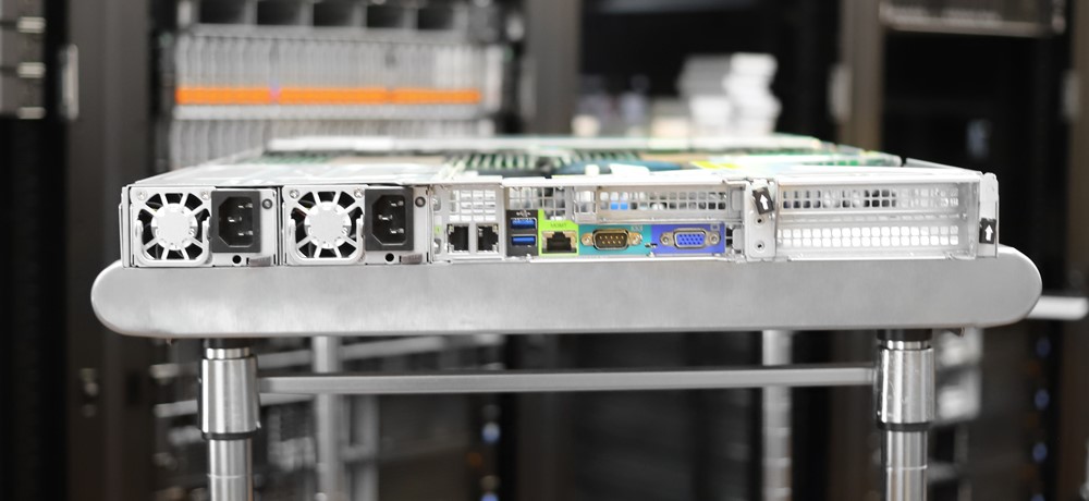 Tất cả kết nối đều nằm ở mặt sau của khung máy, ngoài các mô-đun cấp nguồn dự phòng. Từ trái sang phải là hai cổng 10GBase-T, hai cổng USB 3.0, một cổng LAN chuyên dụng cho IPMI, một cổng nối tiếp, một nút và chỉ báo UID (chuyển đổi các chỉ báo UID), một cổng VGA và ba khe cắm mở rộng PCI x16 (một khe PCI-E cấu hình thấp và hai PCI-E chiều cao đầy đủ, các khe chiều dài 9,5 inch).