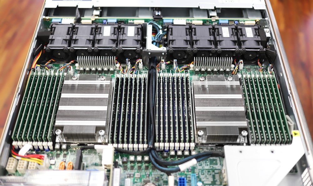 Ở phía trước, bạn sẽ thấy tám quạt PWM hạng nặng (với khả năng điều khiển tốc độ quạt tối ưu), giúp giữ cho hệ thống hoạt động trơn tru. Bên cạnh quạt làm mát cho hệ thống là 32 DIMM cho khe cắm bộ nhớ, hỗ trợ RAM DDR4 3200 MHz ECC RDIMM và bao quanh Dual CPU EPYC 7200 series (bộ xử lý 7003 Series yêu cầu cập nhật lên phiên bản BIOS 2.0 hoặc mới hơn để hỗ trợ thả vào). Ở phía sau bo mạch chủ là các PSU cấp titan 800W / 1000W dự phòng.