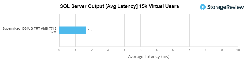 Đối với độ trễ trung bình của SQL Server, Supermicro 1024US-TRT thấy trung bình là 1,5 mili giây với 8VM.