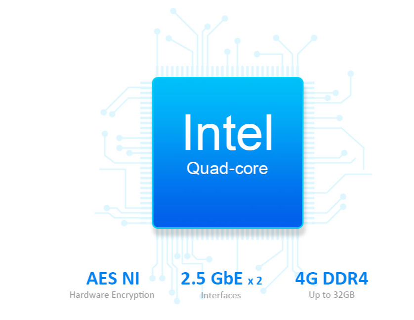 Điểm nhấn đầu tiên trên hai mẫu thiết bị lưu trữ NAS nằm ở sức mạnh bộ xử lý lõi tứ Intel Celeron N5105 / 5095 với tốc độ 2.0 GHz và turbo tối đa lên đến 2.9 GHz cùng 4GB bộ nhớ DDR4, có thể nâng cấp lên đến 32GB mang đến khả năng xử lí khối lượng dữ liệu truy cập đa dạng của khách hàng dễ dàng.