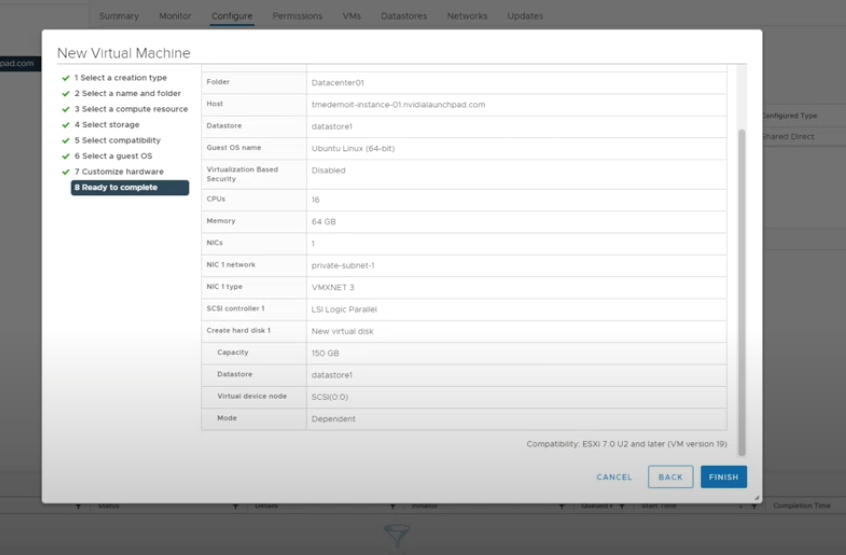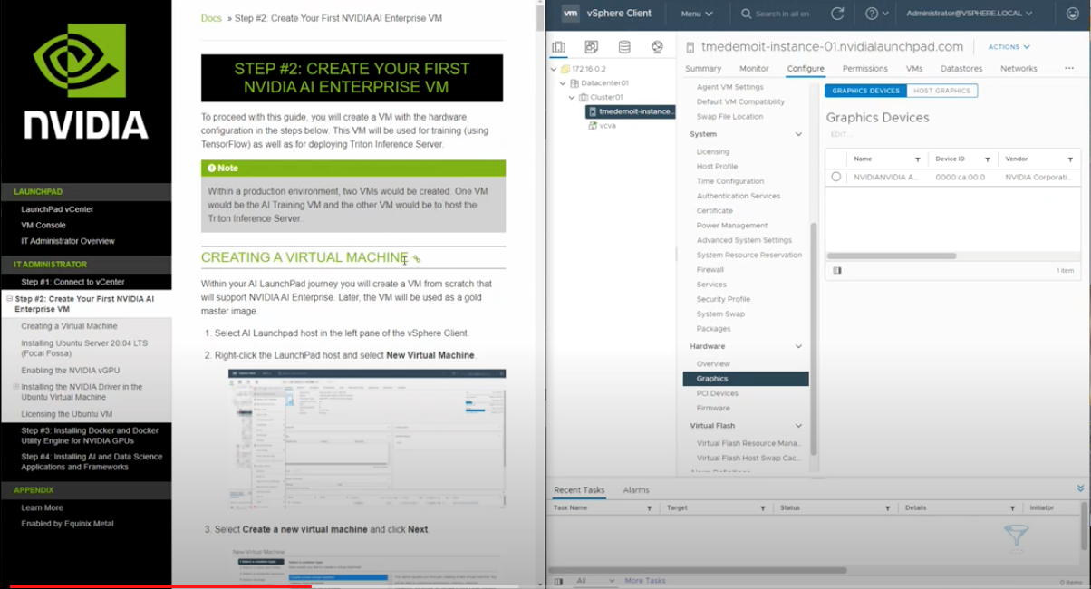 Việc cấu hình máy ảo được ghi chép đầy đủ và các màn hình nhập liệu có trợ giúp cần thiết nếu cần. NVIDIA đã làm việc với VMware nhằm tạo ra một giao diện đơn giản để triển khai cấu hình yêu cầu và cài đặt các công cụ thích hợp để thiết lập và chạy môi trường với mức độ tối thiểu. Hãy cùng làm rõ về điểm này.với một thử nghiệm cụ thể sau đây, môi trường thử nghiệm có Dell PowerEdge R750 , với NVIDIA A30 và nhiều DRAM và CPU số lõi lớn.
