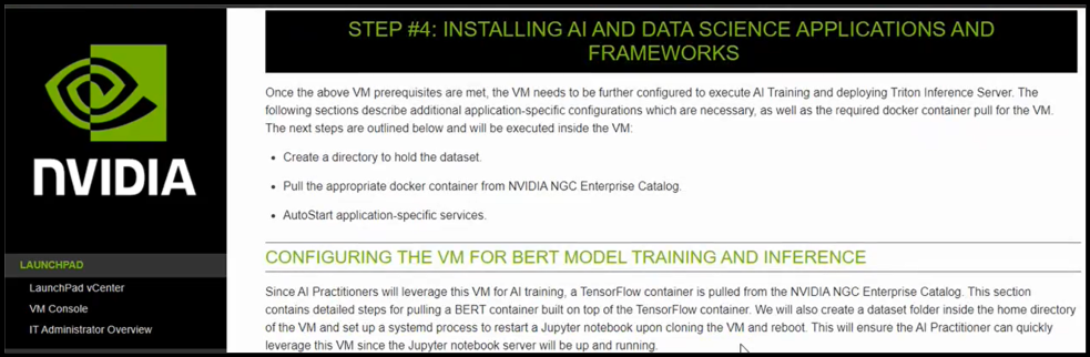 NVIDIA gần đây đã giơi thiệu LaunchPad – một môi trường thực hành nơi người dùng doanh nghiệp có thể sử dụng máy chủ NVIDIA AI Enterprise trong môi trường vSphere 7 miễn phí trong 2-4 tuần. Mặc dù các doanh nghiệp được hoan nghênh sử dụng dịch vụ này với khối lượng công việc mà họ đang xem xét triển khai trên môi trường NVIDIA, nhưng họ cũng có thể trải qua các phòng thí nghiệm mà NVIDIA đã tạo để cho phép các chuyên gia CNTT cảm thấy thoải mái khi sử dụng các máy chủ hỗ trợ NVIDIA.