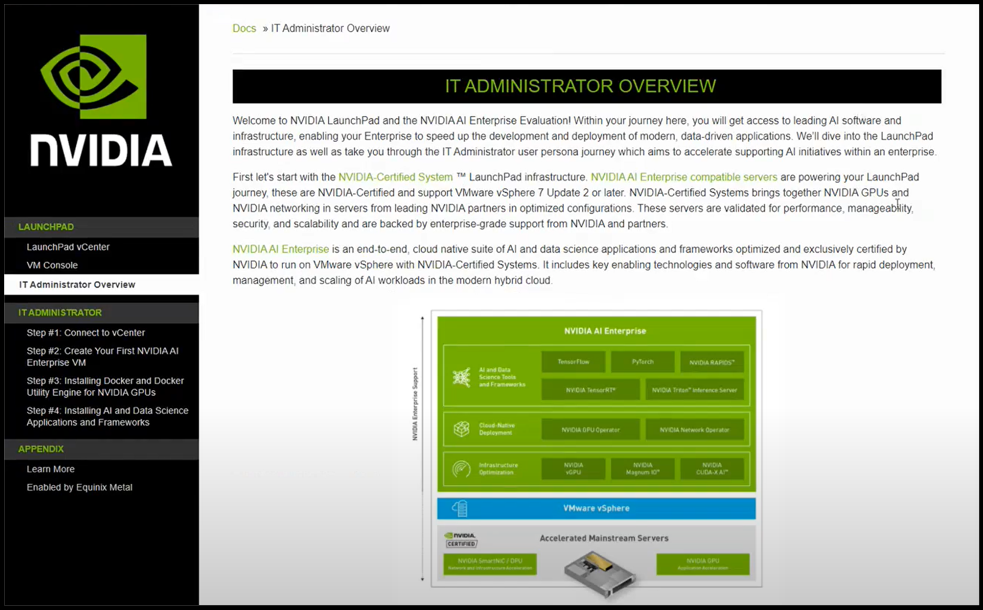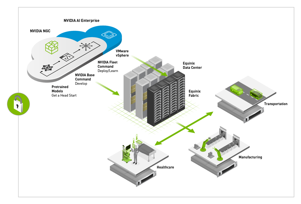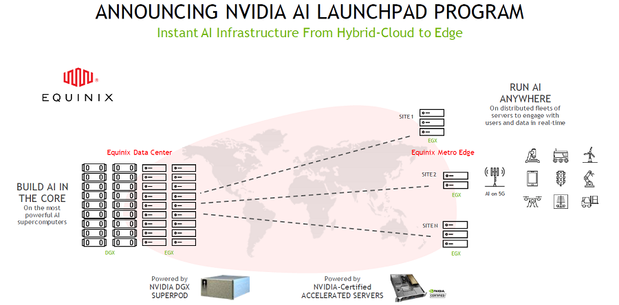 NVIDIA AI LaunchPad được lưu trữ trong một cơ sở Equinix . Nền tảng này cho phép các doanh nghiệp tăng tốc độ phát triển của các mô hình AI phức tạp bằng cách sử dụng DGX SuperPOD, NVIDIA Base Command, NVIDIA Fleet Command và các mô hình được đào tạo trước từ NVIDIA NGC. Nó cũng hỗ trợ mở rộng AI chính thống trên các máy chủ được Chứng nhận NVIDIA phân phối trên mạng. Các máy chủ tiêu chuẩn ngành này lý tưởng để chạy bộ phần mềm NVIDIA AI Enterprise trên VMware vSphere để mở rộng khối lượng công việc AI trong đám mây lai hiện đại.