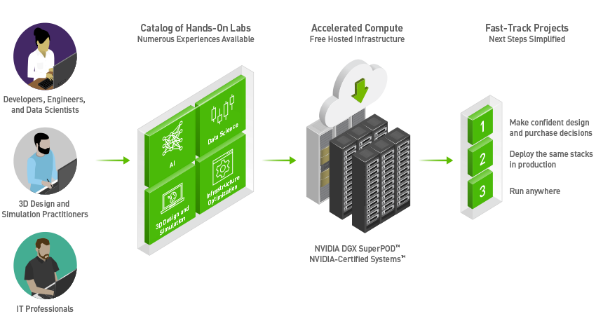 NVIDIA cho rằng việc một số công ty không sử dụng nhiều AI vì lo ngại sự phức tạp của việc thiết lập một môi trường mà AI có thể hoạt động. Với suy nghĩ này, NVIDIA đã tạo ra các phòng thí nghiệm được thiết kế để giải quyết với hai chuyên gia AI khác nhau: Các quản trị viên và người quản lý CNTT cần đứng lên và hỗ trợ các môi trường AI và những người thực hành AI cần sử dụng chúng. Cung cấp dịch vụ này sẽ giúp xây dựng niềm tin vào việc hỗ trợ và sử dụng AI trước khi đầu tư ngân sách CNTT để xây dựng cơ sở hạ tầng cụ thể để chạy các ứng dụng AI đó. Hơn nữa, việc triển khai khối lượng công việc AI trong môi trường này, với các công cụ quen thuộc, cho phép các nhà phát triển nhận ra giá trị của dự án AI của họ với GPU NVIDIA.