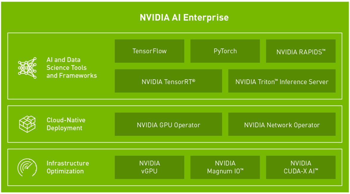 “ Một bộ phần mềm phân tích dữ liệu và AI từ đầu đến cuối, dựa trên đám mây, được NVIDIA tối ưu hóa, chứng nhận và hỗ trợ để chạy trên VMware vSphere với Hệ thống được chứng nhận của NVIDIA. Nó bao gồm các công nghệ nổi bật từ NVIDIA để triển khai, quản lý và mở rộng nhanh chóng khối lượng công việc AI trong đám mây lai hiện đại . ”